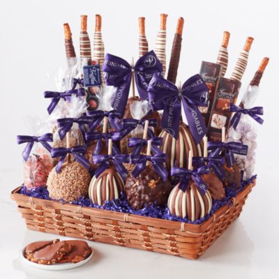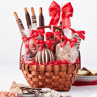 Bloomingdale's. Mrs. Prindables Grand Festive Gift Basket. Includes: (1) Triple Chocolate Holiday Jumbo Caramel Apple (1) Triple Chocolate Petite Caramel Apple (1) Milk Chocolate Walnut Petite Caramel Apple (4) Chocolate and Caramel Pretzel Rods (1) Dark Chocolate Peppermint Bark (1) Bag of Assorted Natural Caramels & much more...$110.00