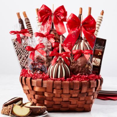 Bloomingdale's. Mrs. Prindable's Premium Festive Deluxe Caramel Apple Basket Gift Set. Includes: (1) Triple Chocolate Holiday Jumbo Caramel Apple (1) Milk Chocolate Walnut Pecan Holiday Jumbo Caramel Apple (2) Triple Chocolate Petite Caramel Apples (1) Milk Chocolate Walnut Petite Caramel Apple (6) Chocolate and Caramel Pretzel Rods (1) Dark Chocolate Peppermint Bark & much more...$144.00
